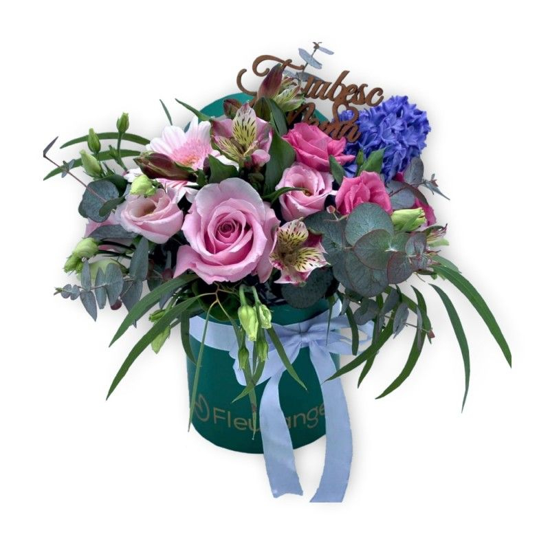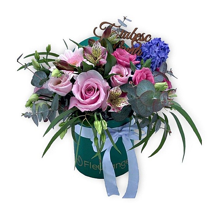 Cutia Te iubesc, Mama conține: eucalipt, 1 trandafir, 1 zambila, 1 lisianthus, 1 germini, 2 alstroemeria, mesaj „Te iubesc, mamă!”, fundiță, cutie Fleurange.