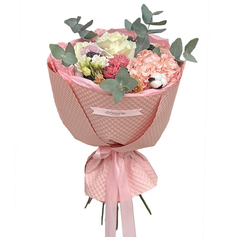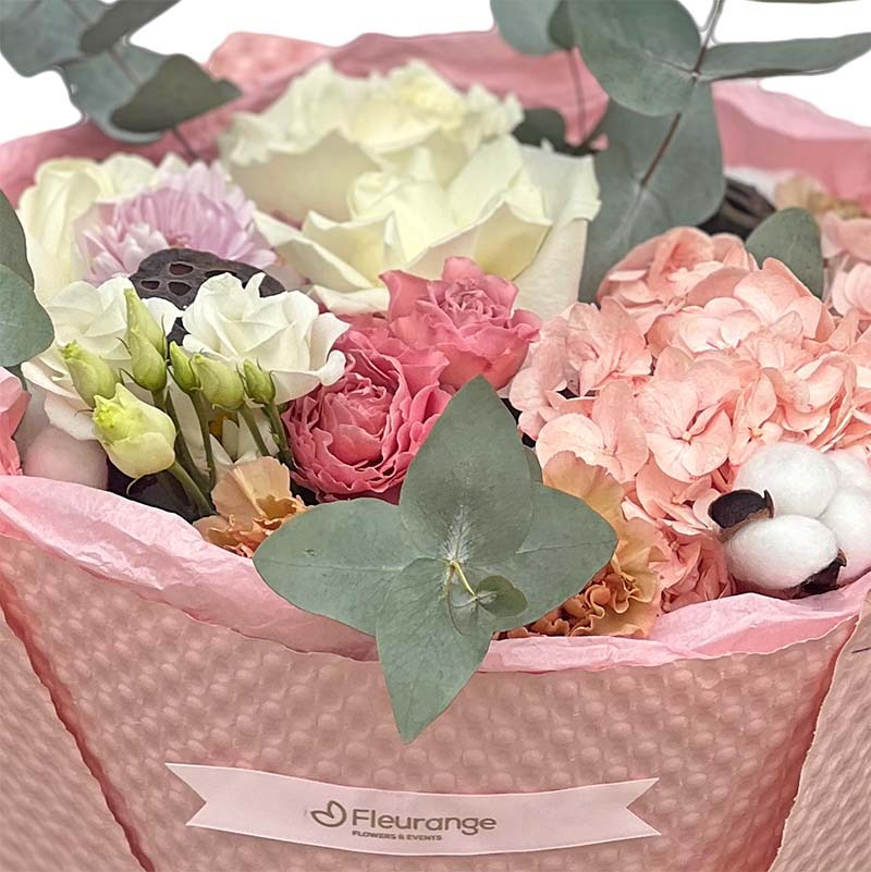 Flori: Bumbac, Chrysantheme, Eucalipt Cinerea, Garoafe, Hortensia, Lisianthus, Lotus, Mini-rosa, Ranunculus, Trandafiri, Achillea