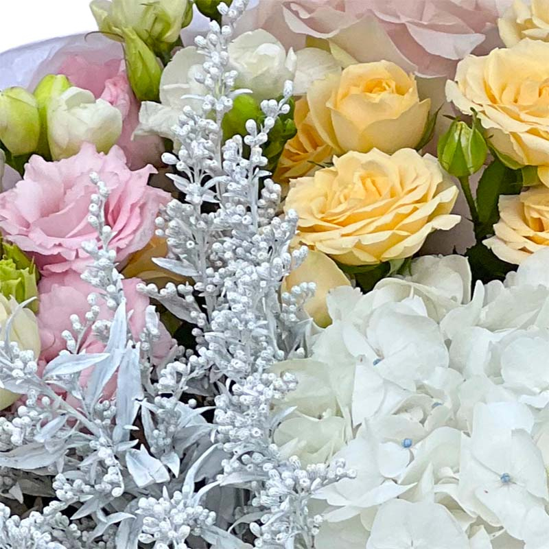 Flori: Freesii, Hortensia, Lisianthus, Mini-rosa, Solidago, Trandafiri