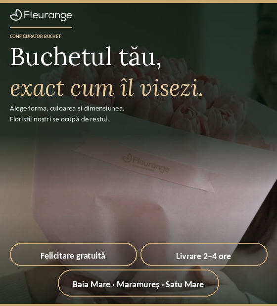 Livrăm buchete de flori proaspete în termen de 2–4 ore în Baia Mare și în localitățile din Maramureș și Satu Mare. Fiecare comandă poate fi însoțită de o felicitare gratuită cu mesajul ales de tine.
