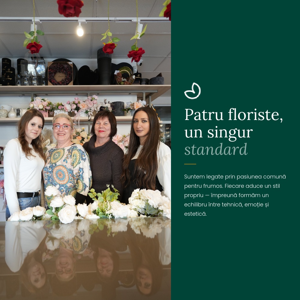 Suntem o echipă de floriști, legați prin pasiunea comună pentru frumos. Fiecare dintre noi aduce un stil propriu, dar împreună formăm un echilibru între tehnică, emoție și estetică.