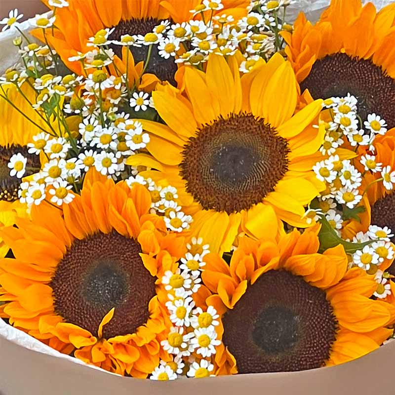Un buchet fermecător care îmbină căldura toamnei cu tandrețea inocenței — „Buchet 7 Floarea Soarelui” aduce un strop de soare în orice moment. Cele 7 Helianthus evocă fericire, energie și optimism, în timp ce mugurii de Matricaria (floarea-miresei) adaugă eleganță aerată și prospețime vizuală. Împodobit cu o panglică fină semnată Fleurange și însoțit de o felicitare cadou, acest buchet este un ambasador al bucuriei sincere.
